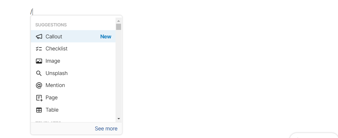 coda 페이지 작성은 /로 시작합니다. /입력시 다음과 같은 화면이 보이게 되는데요 이번에는 테이블을 생성해보도록 하겠습니다. /table 입력 혹은 /입력 후 table을 선택해주시면 됩니다.