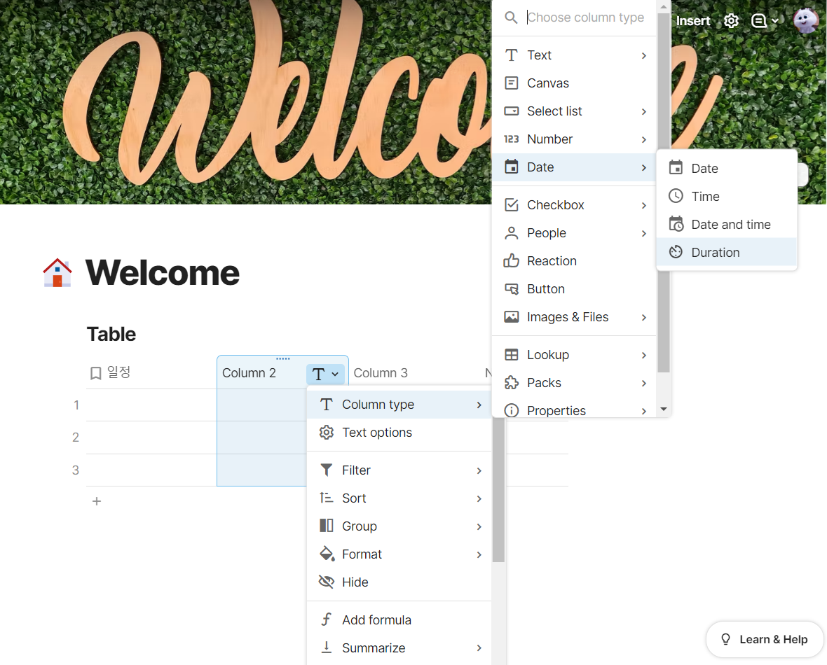 Column 2에 날짜를 입력하기위해 Column Type을 Date로 설정합니다. 날짜만 입력할 것이기 때문에 date를 선택해줍니다. 날짜와 시간을 입력할 경우 date and time을 선택해주시면 되겠습니다.