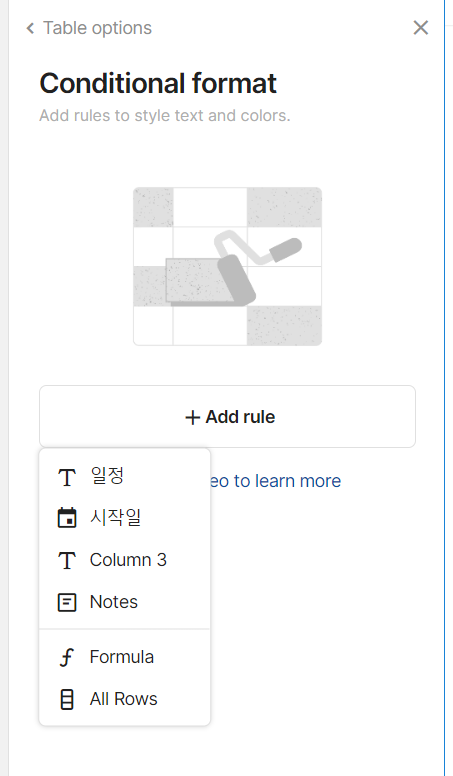 add rule에 마우스를 올리면 columns이 뜹니다. 원하는 컬럼을 선택합니다. 저는 일정 컬럼에 색을 입히기 위해 일정 컬럼을 선택하겠습니다.